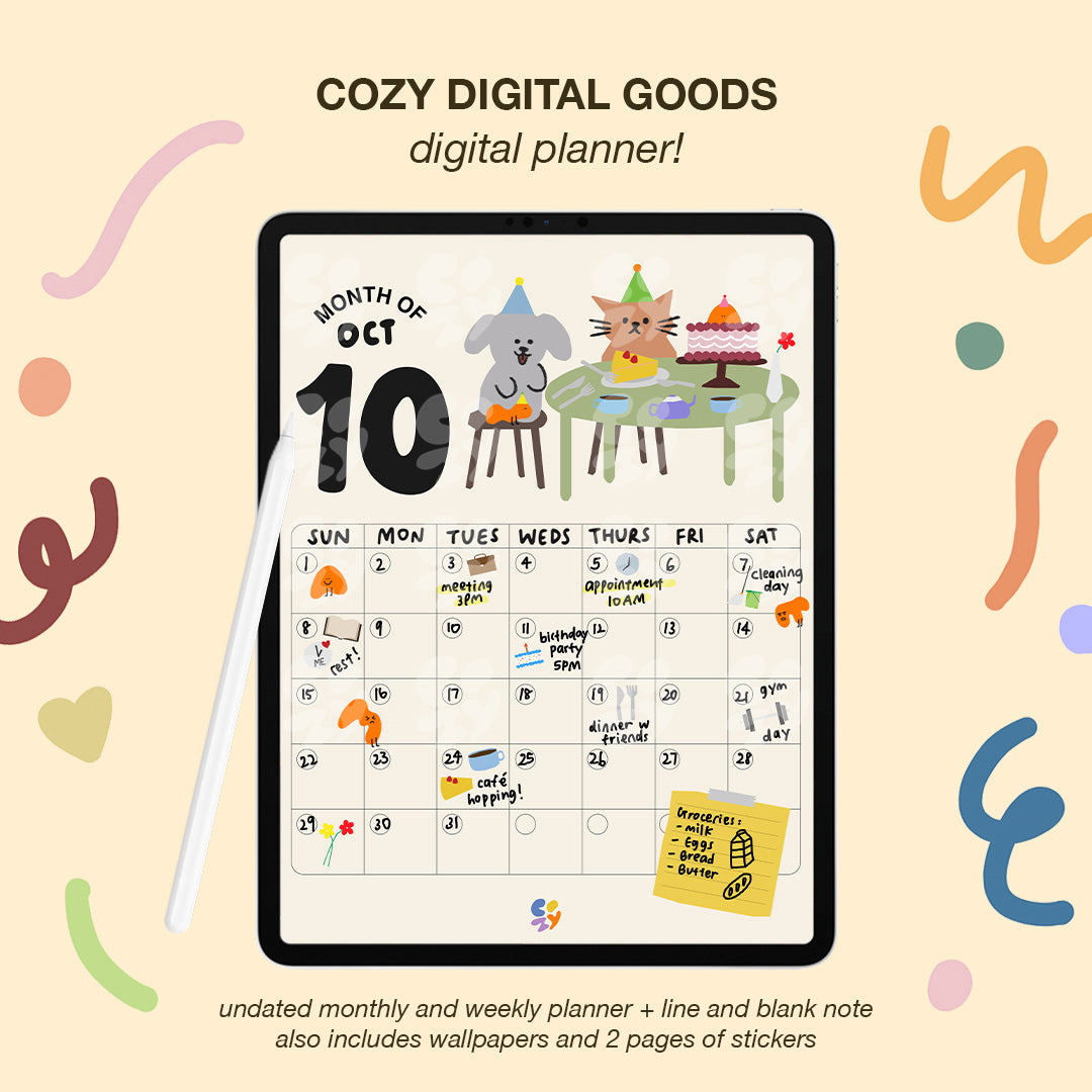 The Cozy Cabin's New Digital Planner for GoodNotes - where organization meets adorable charm! Say hello to our delightful digital planner featuring the beloved Cozy Characters: Pipi the Cat, Pupu the Doggo, and their blupe companions. This digital planner is designed to bring joy and efficiency to your planning routine.